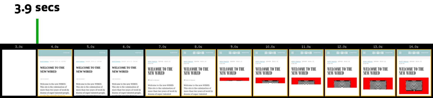 Permalink to 'Back to Weight vs. Wait!'To illustrate just how much these perceived performance optimizations can help, I applied them to a copy of that Wired article page analyzed above. To compare the before and after results fairly, I ran tests on the rendering time of an unchanged copy of the page and an optimized copy of the page, both hosted on one of our servers. The copied version of the page references the same external third-party assets and has almost identical performance timing to Wired’s real page, but it’s important to note that these optimizations are just a proof of concept and not applied to the actual Wired site. Actual results would vary a bit, but we can still get an idea of how much they’d help.